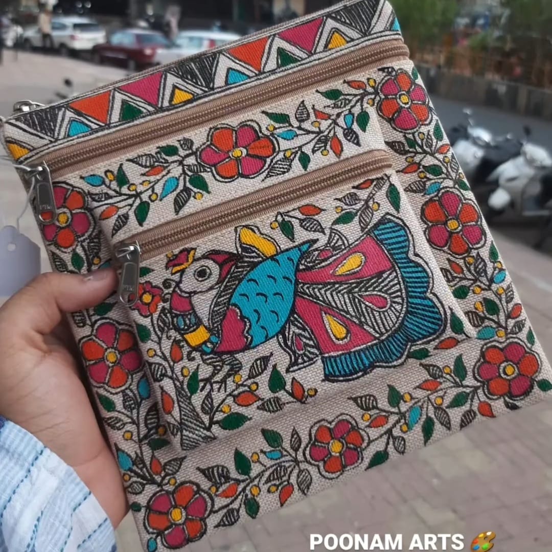Elevate your style with our Peacock Design Sling Bag, showcasing the beauty of Madhubani art. Handcrafted on eco-friendly jute, the vibrant peacock and floral motifs add a touch of cultural elegance. This compact bag features multiple zippered pockets, making it a perfect blend of tradition and functionality for daily use.