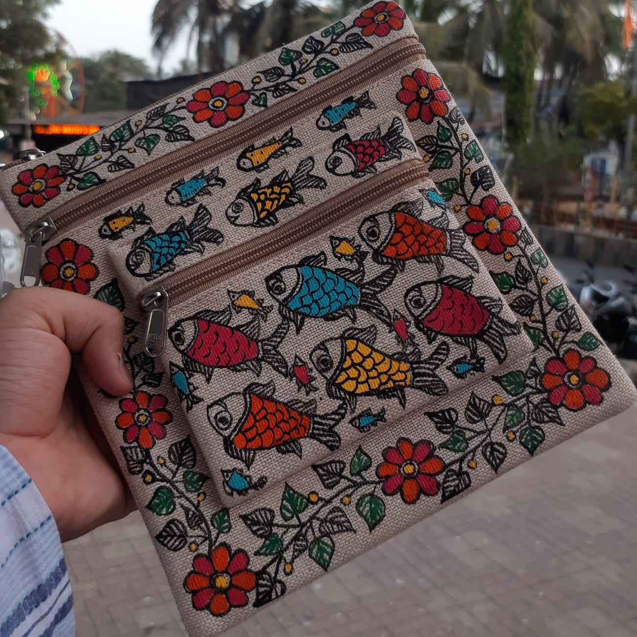 Discover the charm of traditional Indian artistry with our Fish Design Sling Bag. Hand-painted with intricate Madhubani fish motifs and vibrant floral patterns on eco-friendly jute, this compact and lightweight bag offers multiple zippered pockets, making it both a functional and stylish accessory for everyday use.